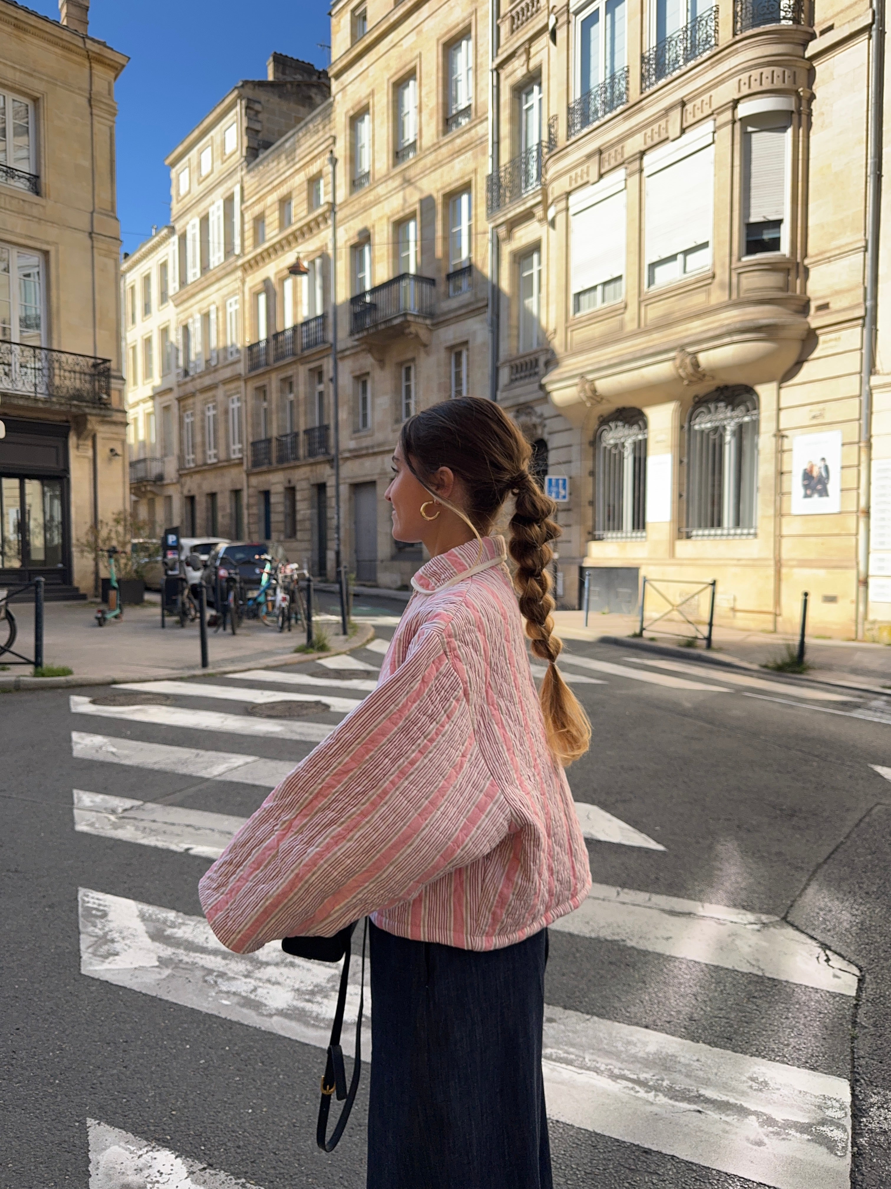 Chaque veste est réalisée à partir d'anciens boutis, chinés un à un, ou de tissus inutilisés. Ils sont ensuite transformés dans notre atelier en pièces uniques.