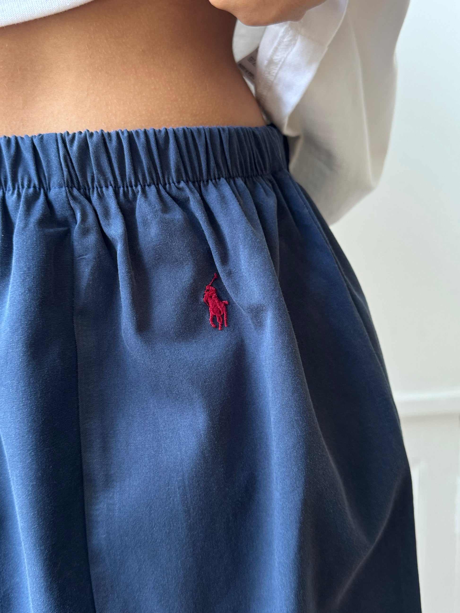 Conception : caleçon femme upcyclé à partir de deux chemises Ralph Lauren de seconde main