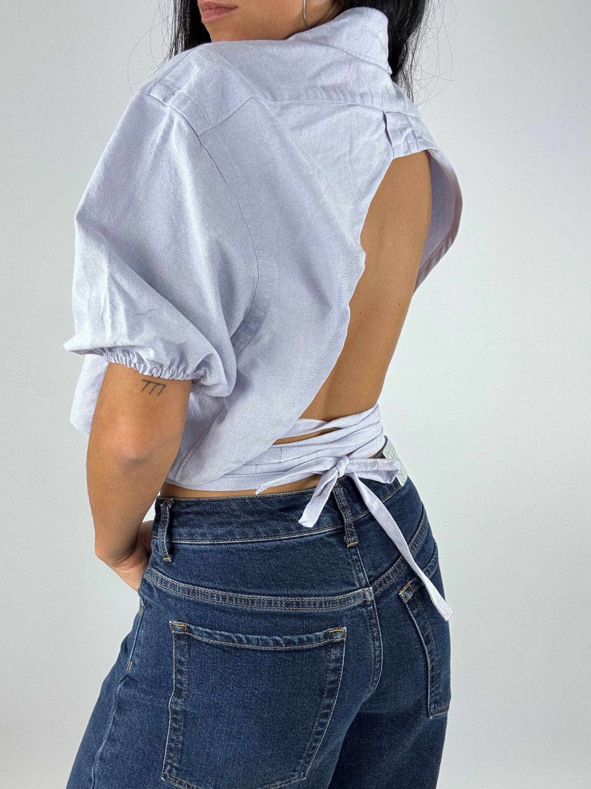 Conception : chemise homme Ralph Lauren de seconde main en taille M/L (38/40) upcyclée en crop dos nu + liens conçus avec la chute de tissu