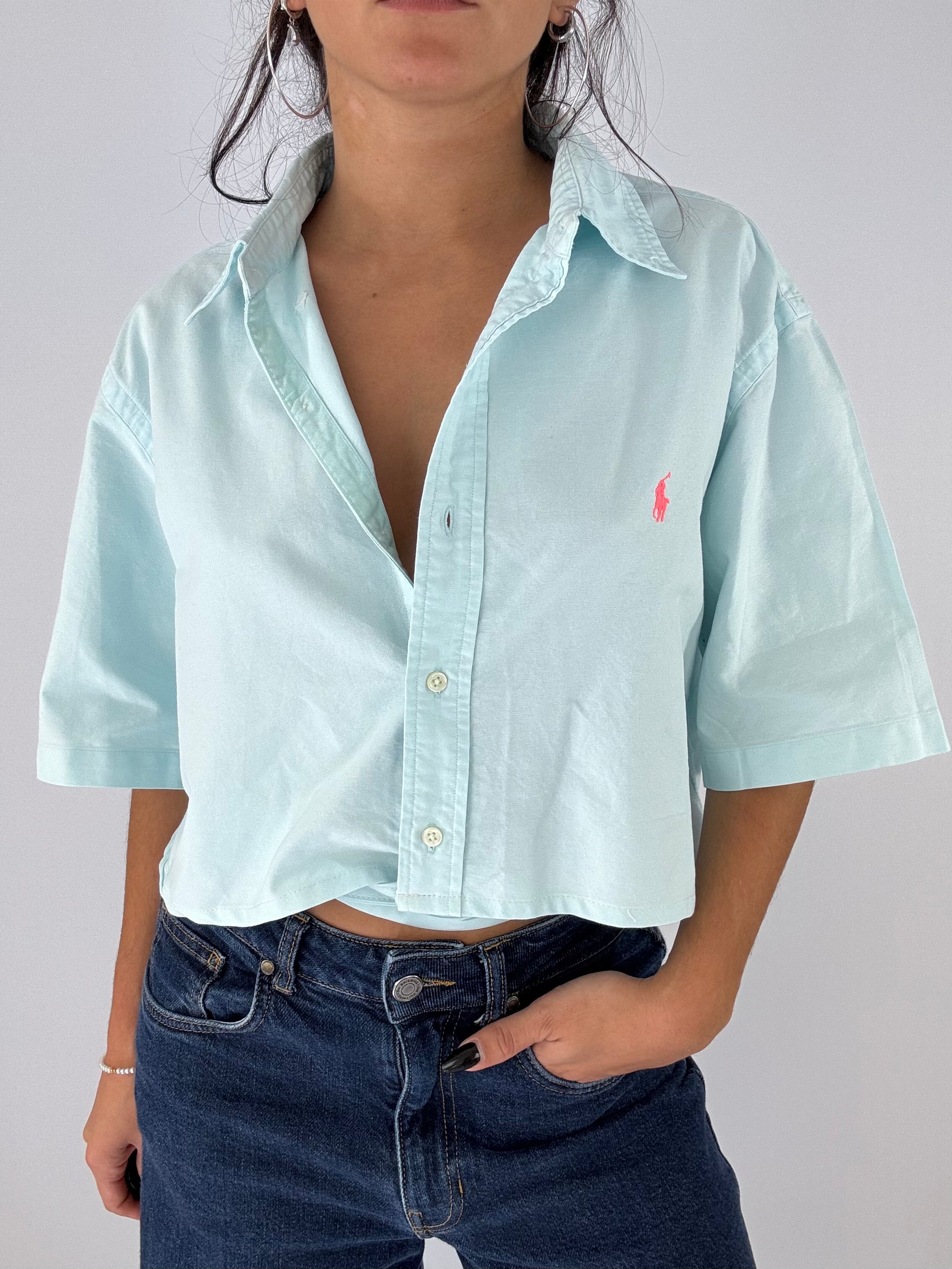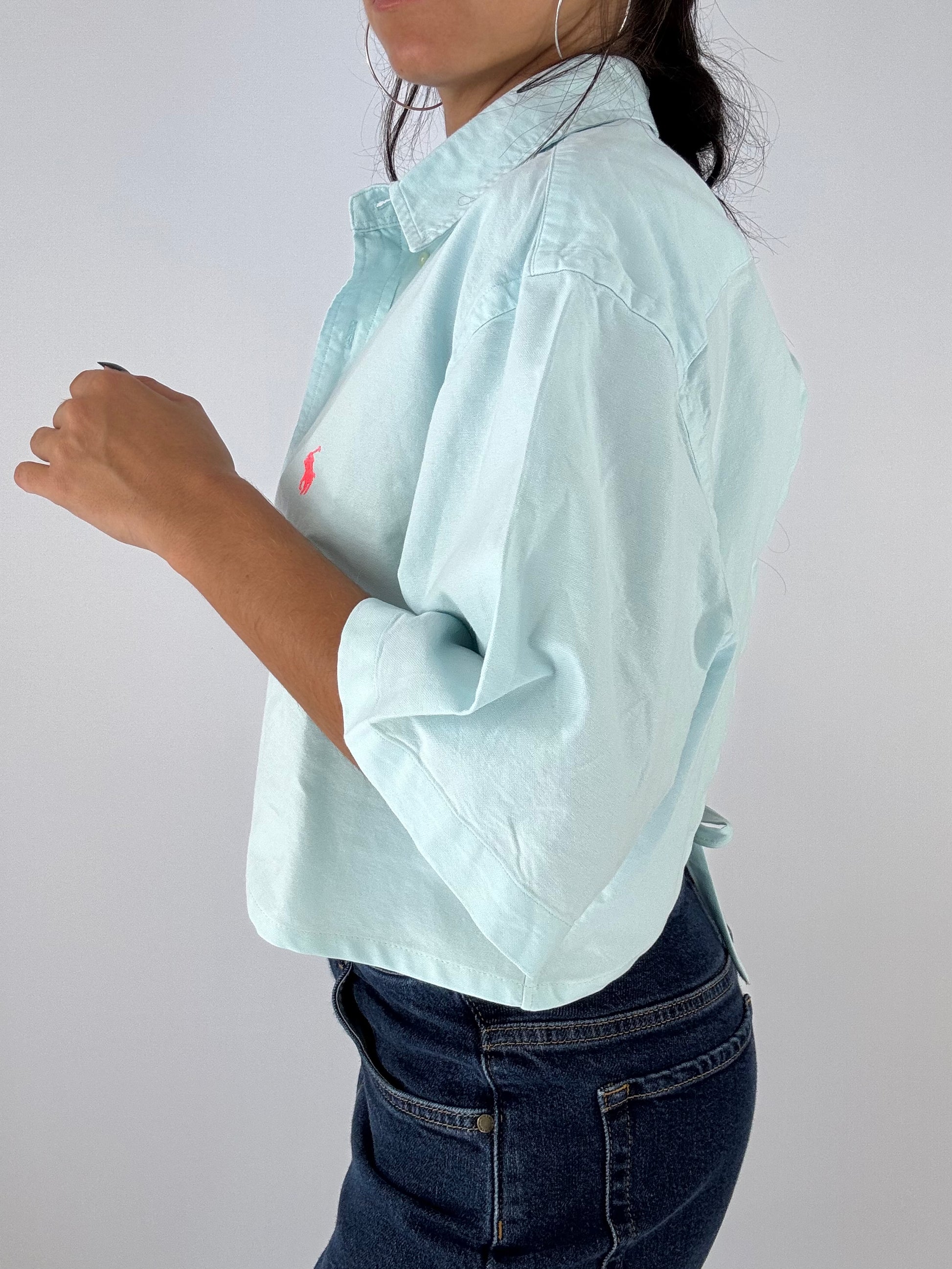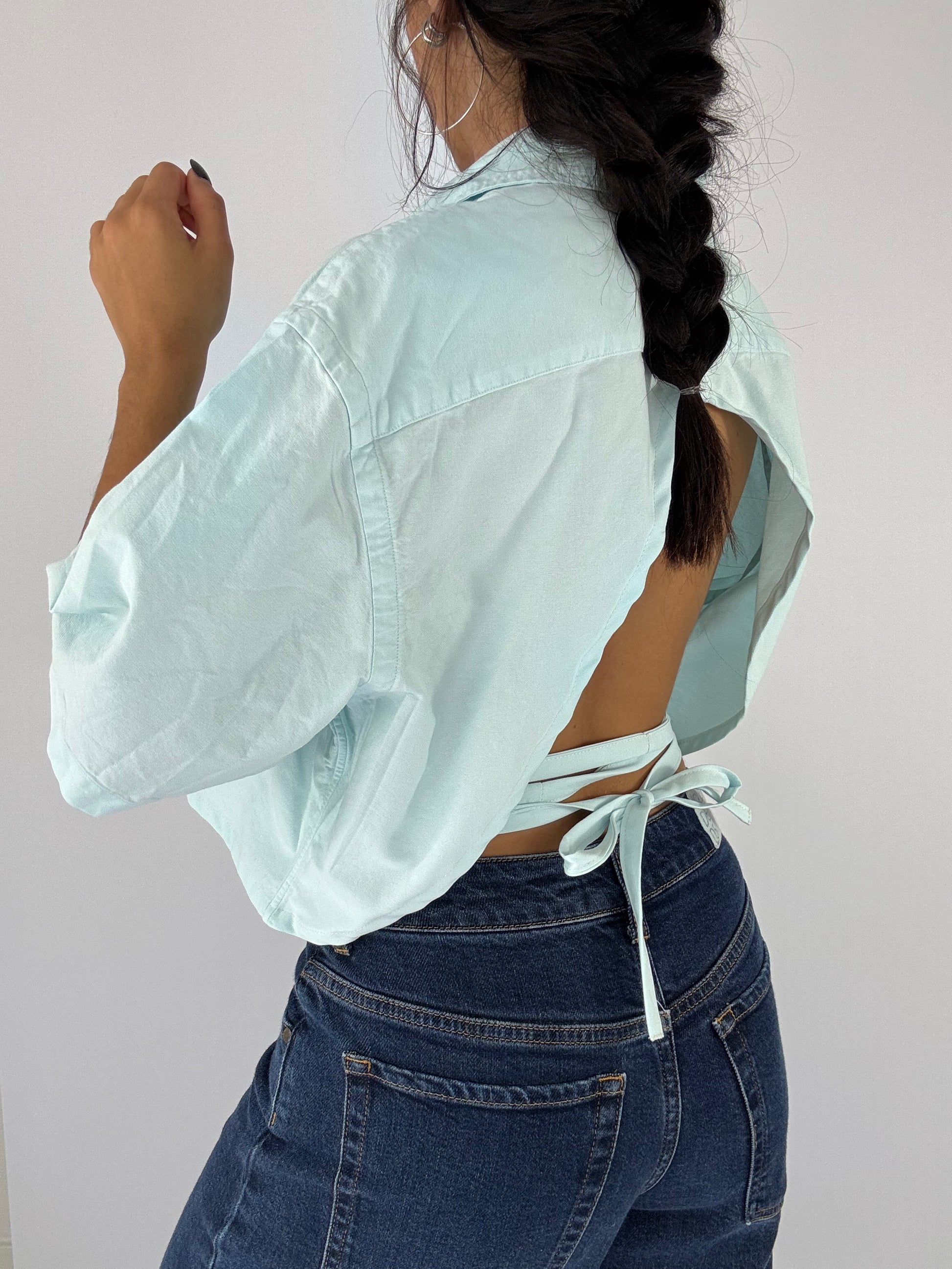 Conception : chemisette homme coupe droite Ralph Lauren de seconde main en taille L (40) upcyclée en crop dos nu + liens conçus avec la chute de tissu