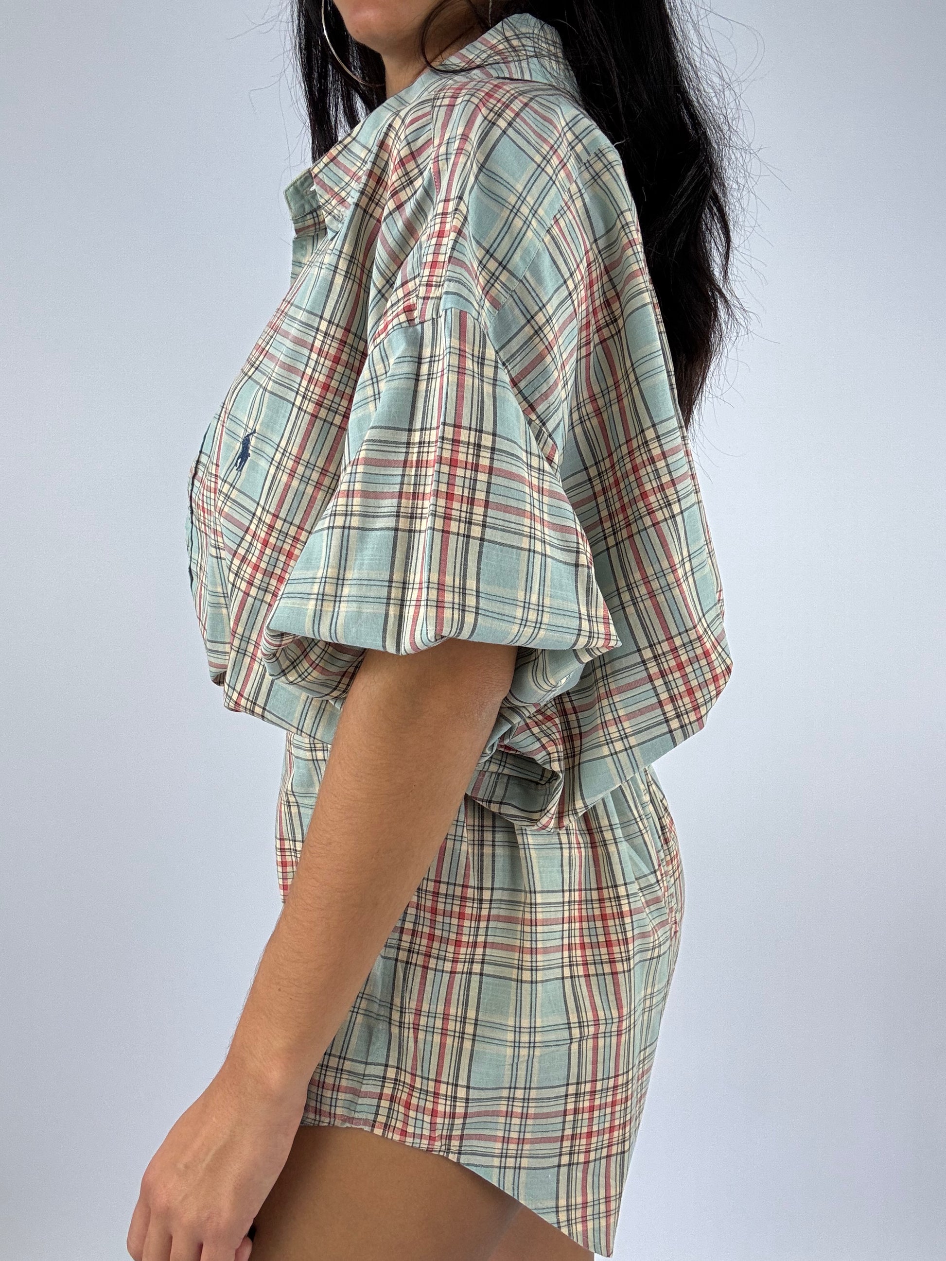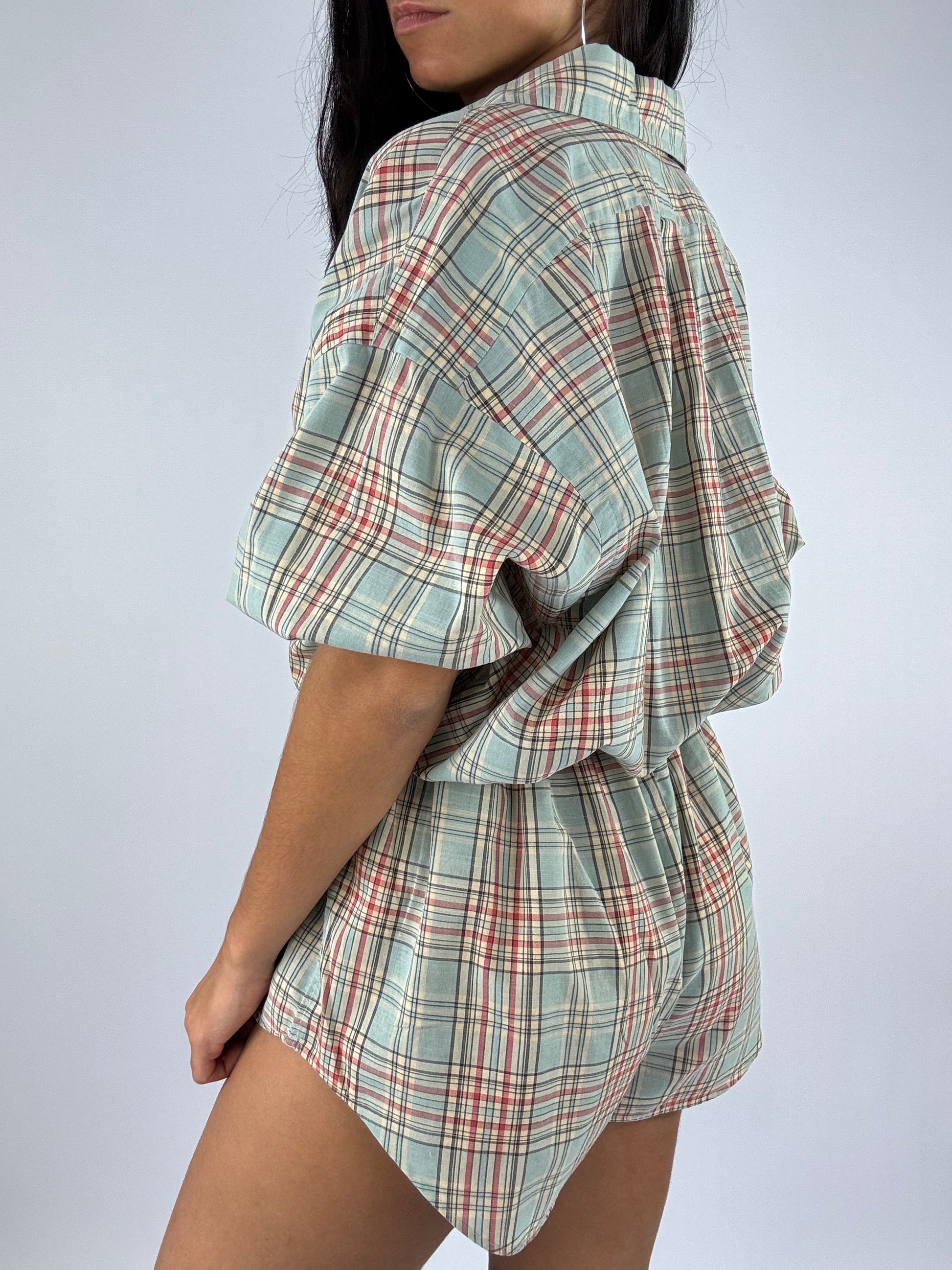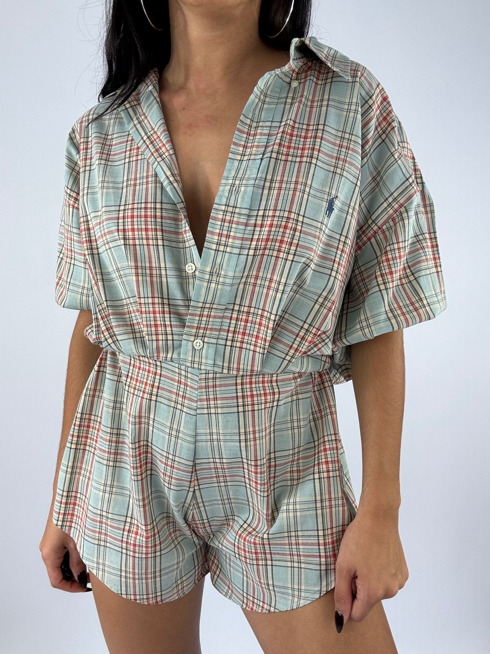 Conception : combinaison upcyclée à partir d'une chemise homme Ralph Lauren de seconde main en taille XL (42)