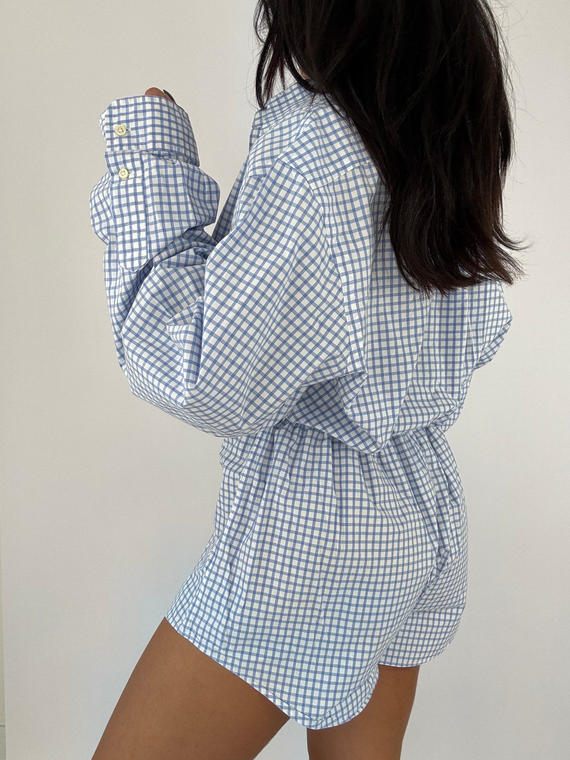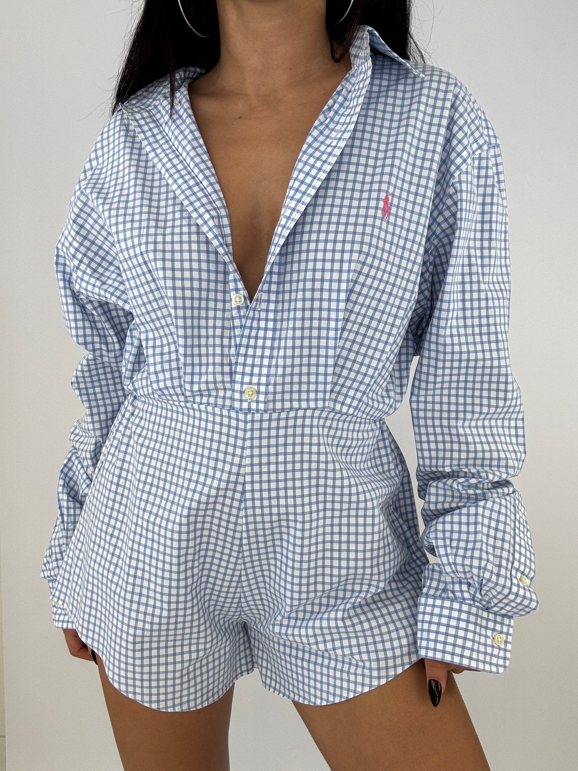 Conception : combinaison upcyclée à partir d'une chemise homme Ralph Lauren de seconde main en taille XL (42)