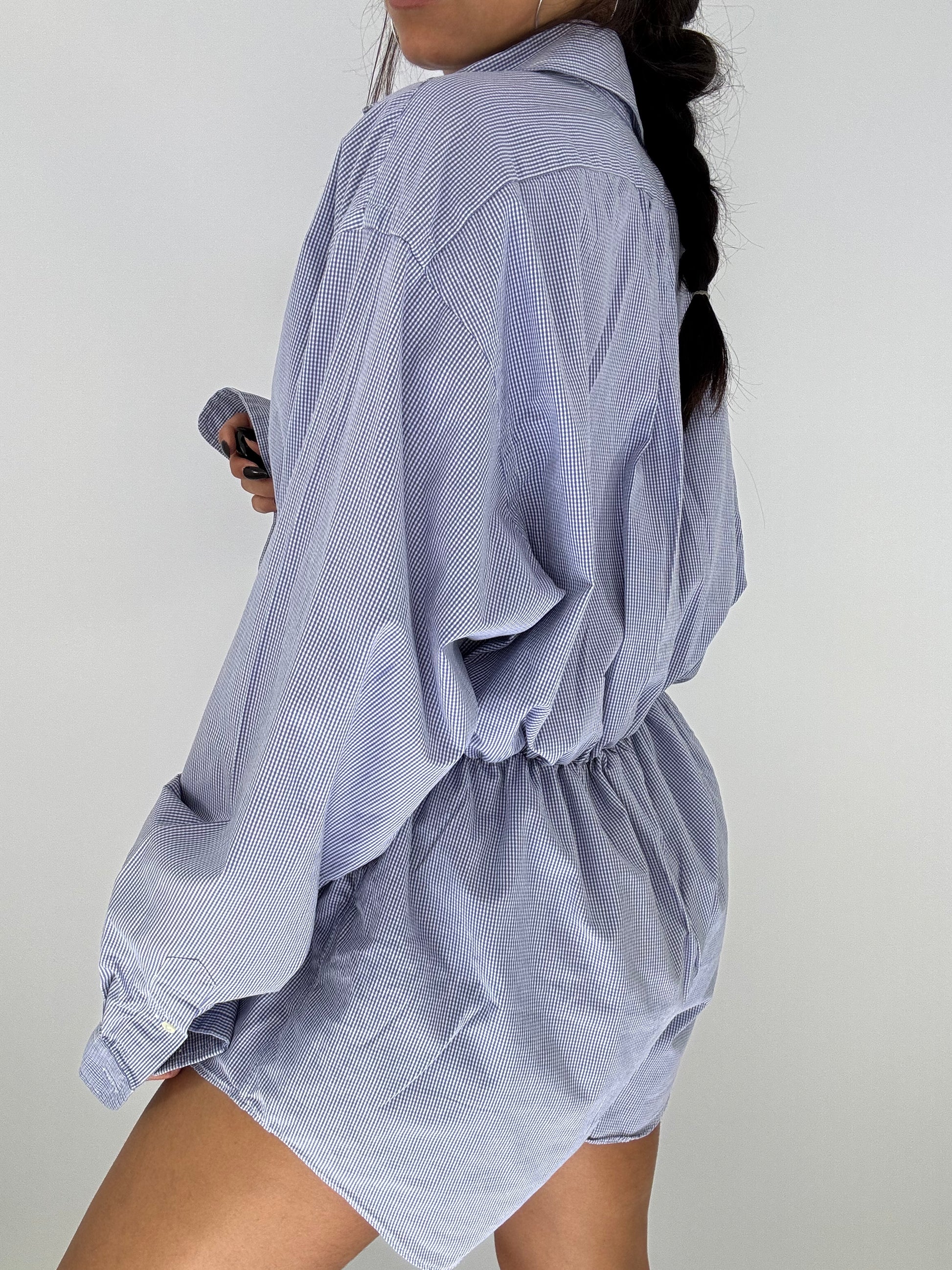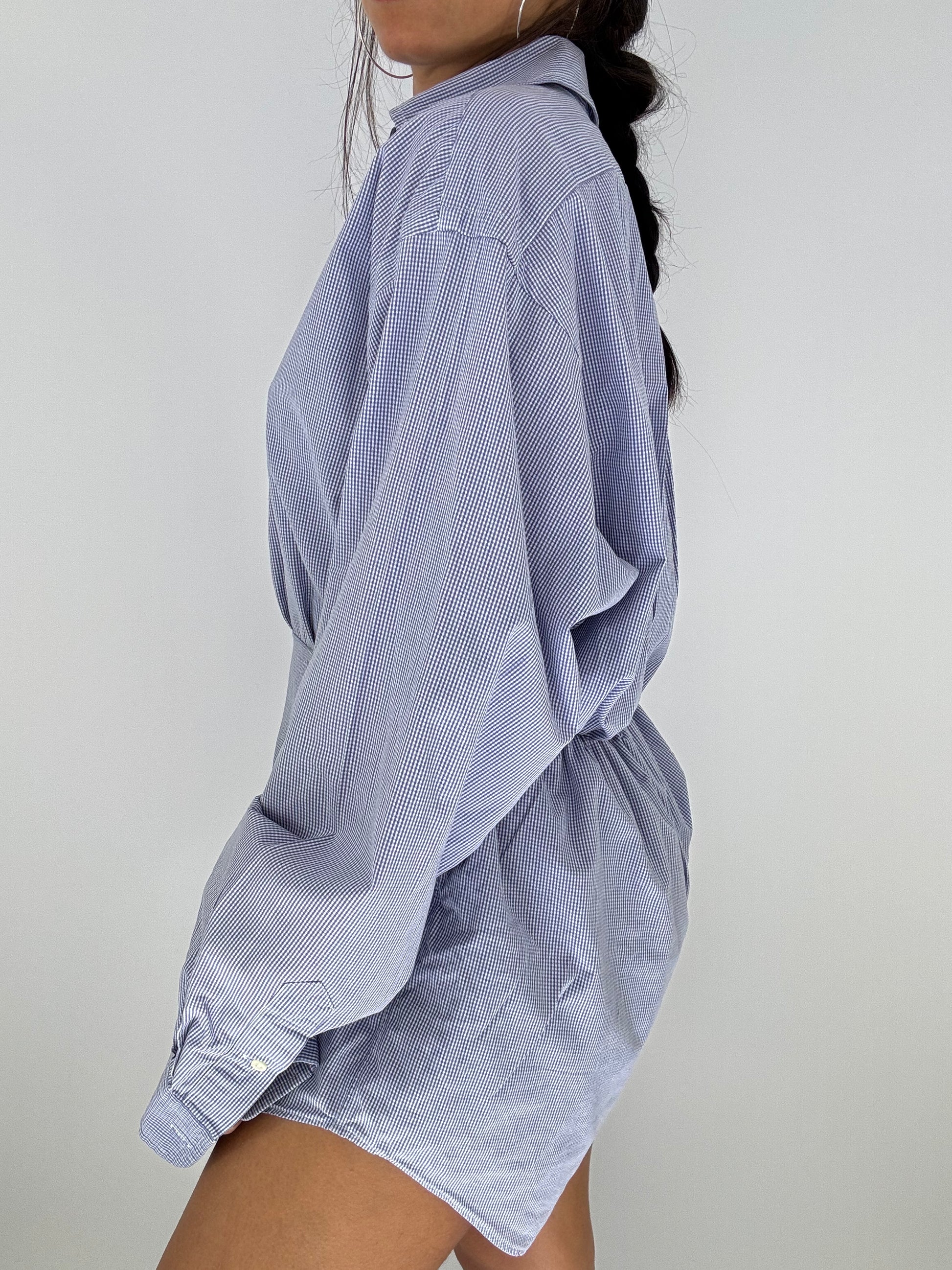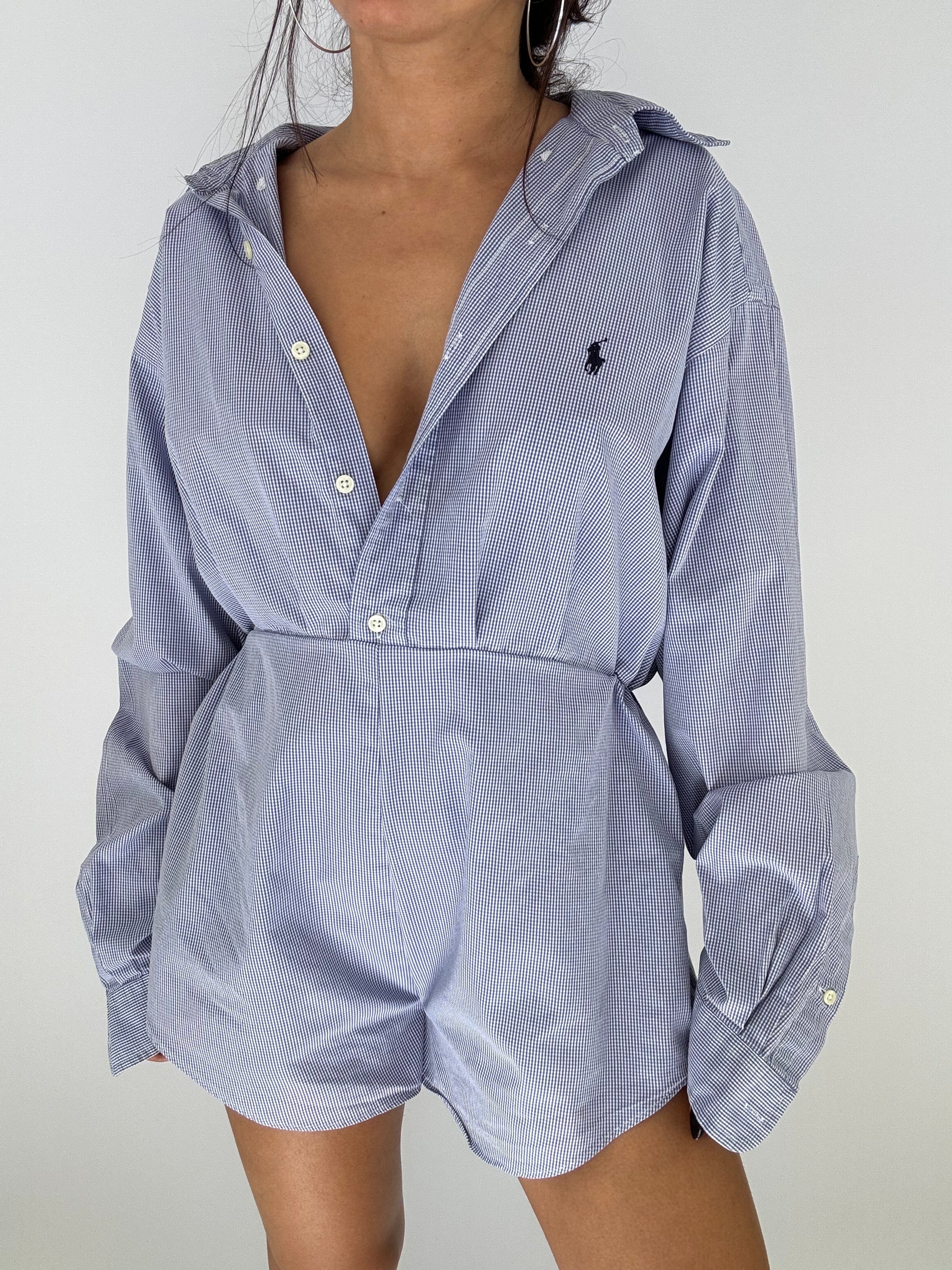 Conception : combinaison upcyclée à partir d'une chemise homme Ralph Lauren de seconde main en taille L (40)