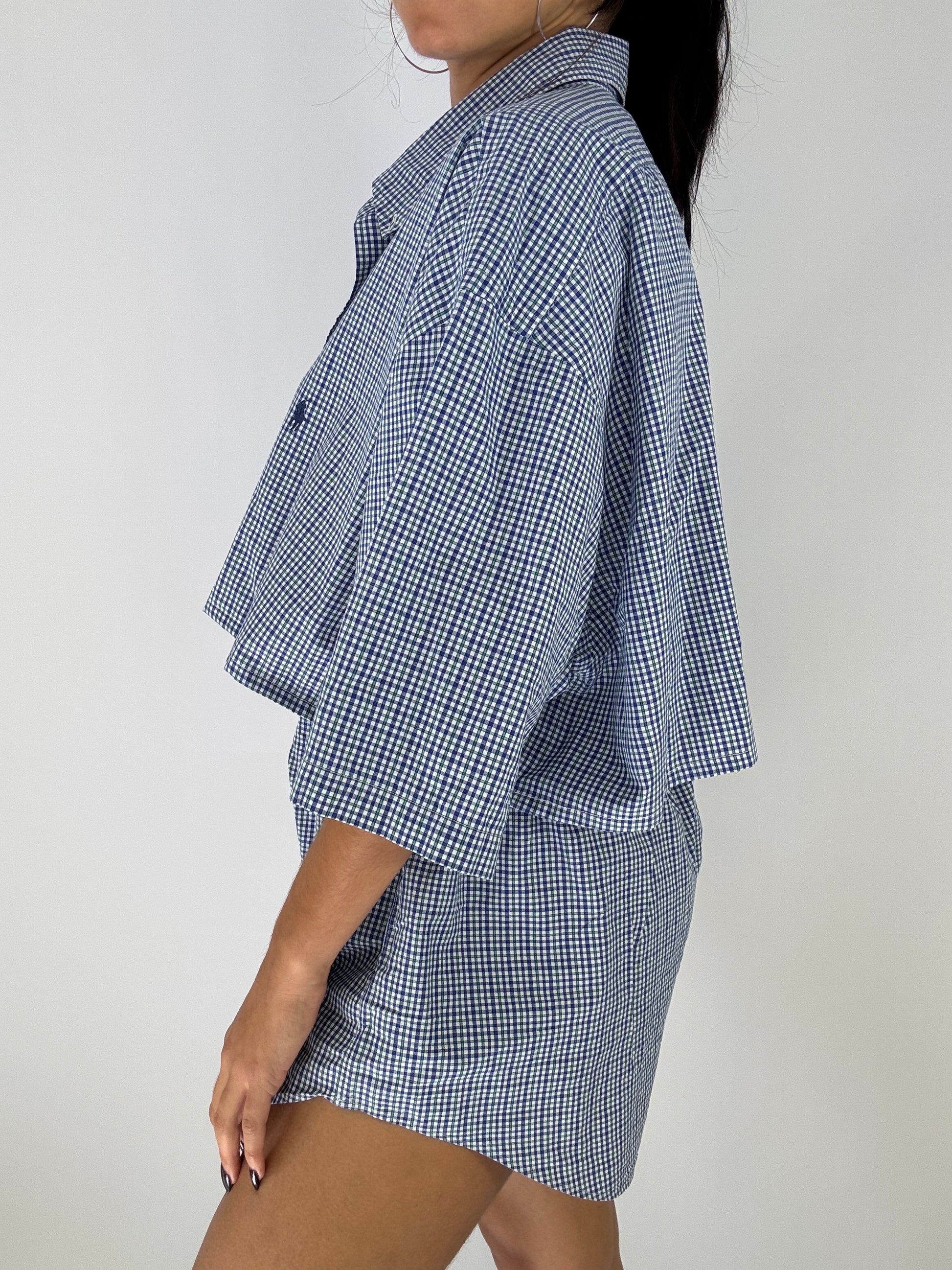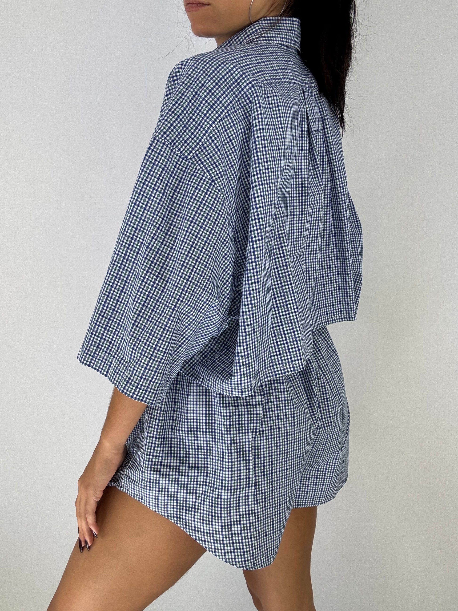 Conception : ensemble upcyclé à partir d'une chemisette homme Ralph Lauren de seconde main en taille XXL (44)