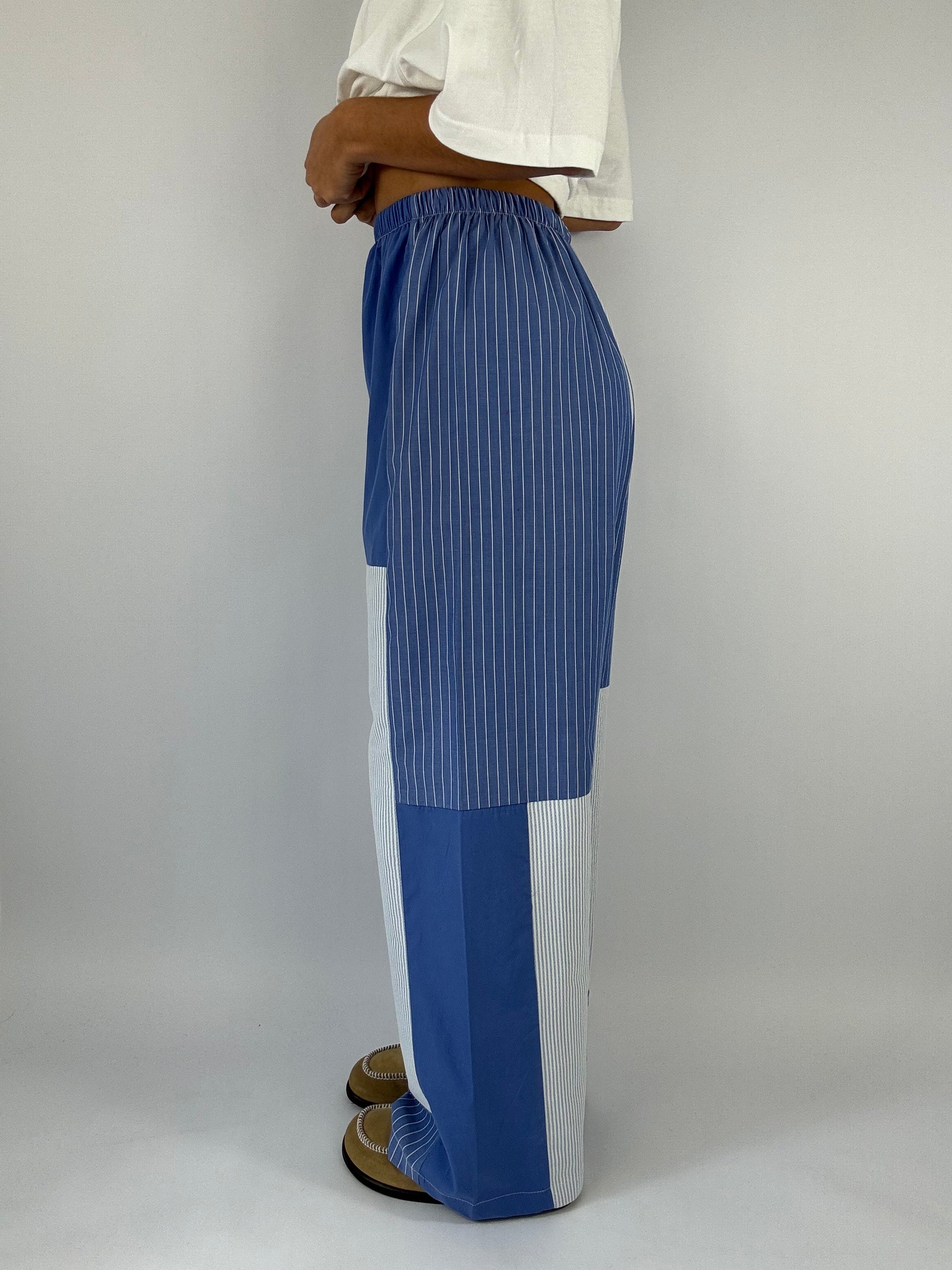 Conception : pantalon femme upcyclé à partir de plusieurs chemises Ralph Lauren de seconde main et de tissus de seconde main
