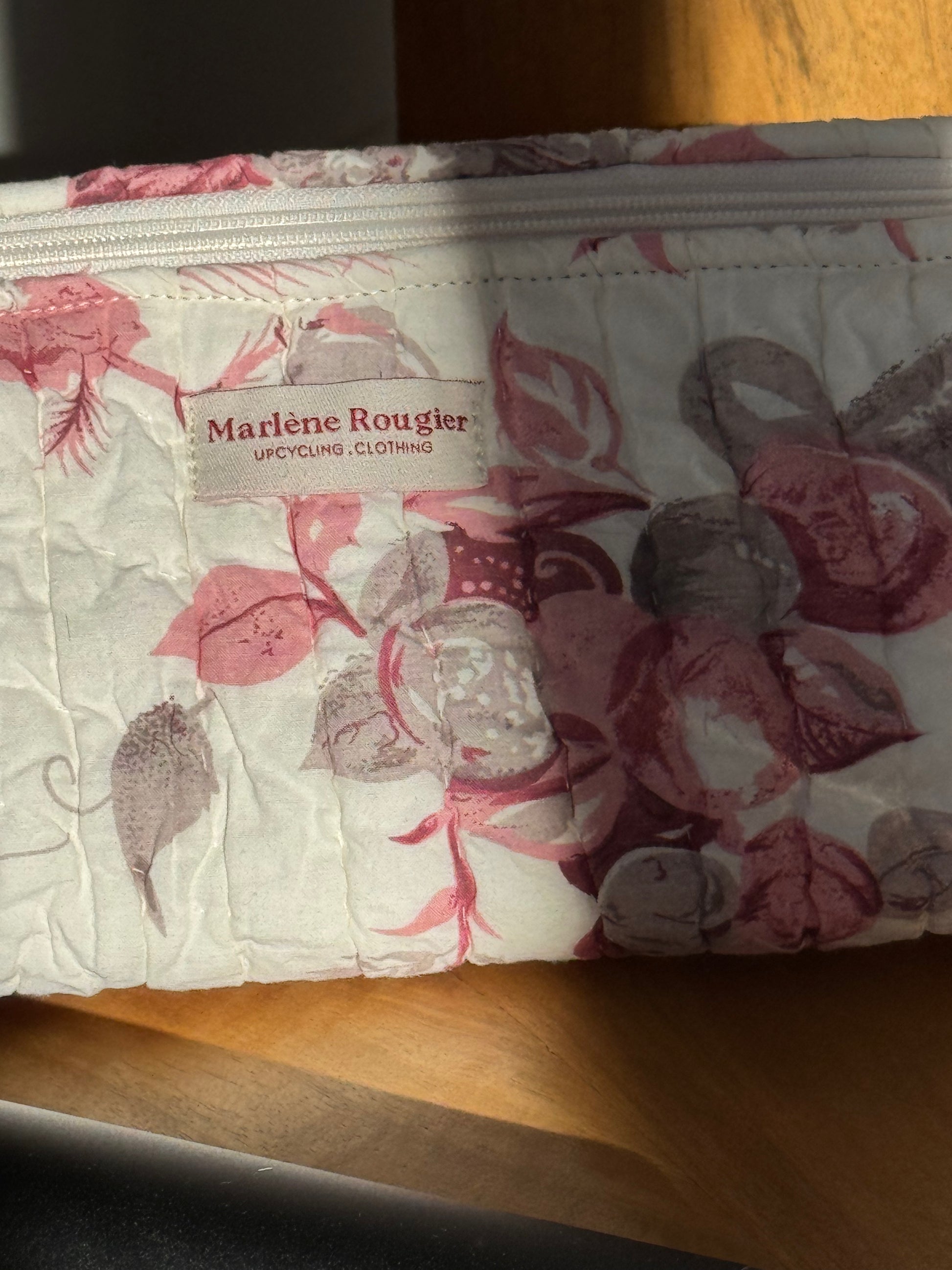 Conception : trousse upcyclée à partir d'un boutis de seconde main + doublure tissu de seconde main + fermeture éclair