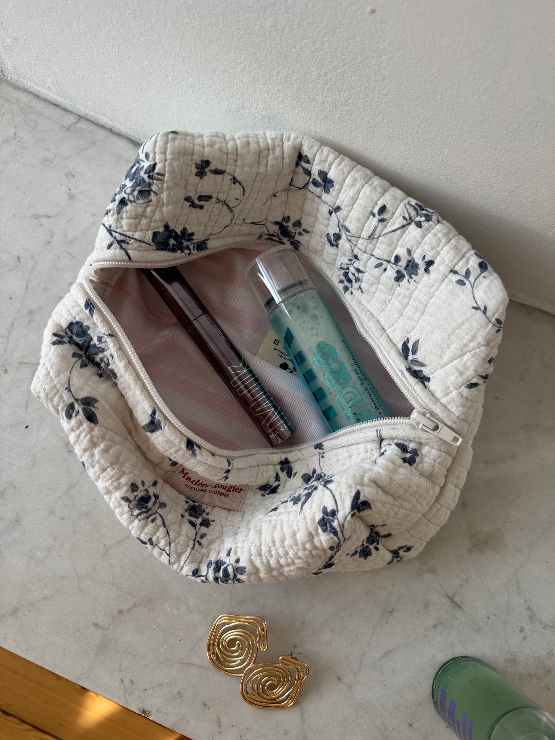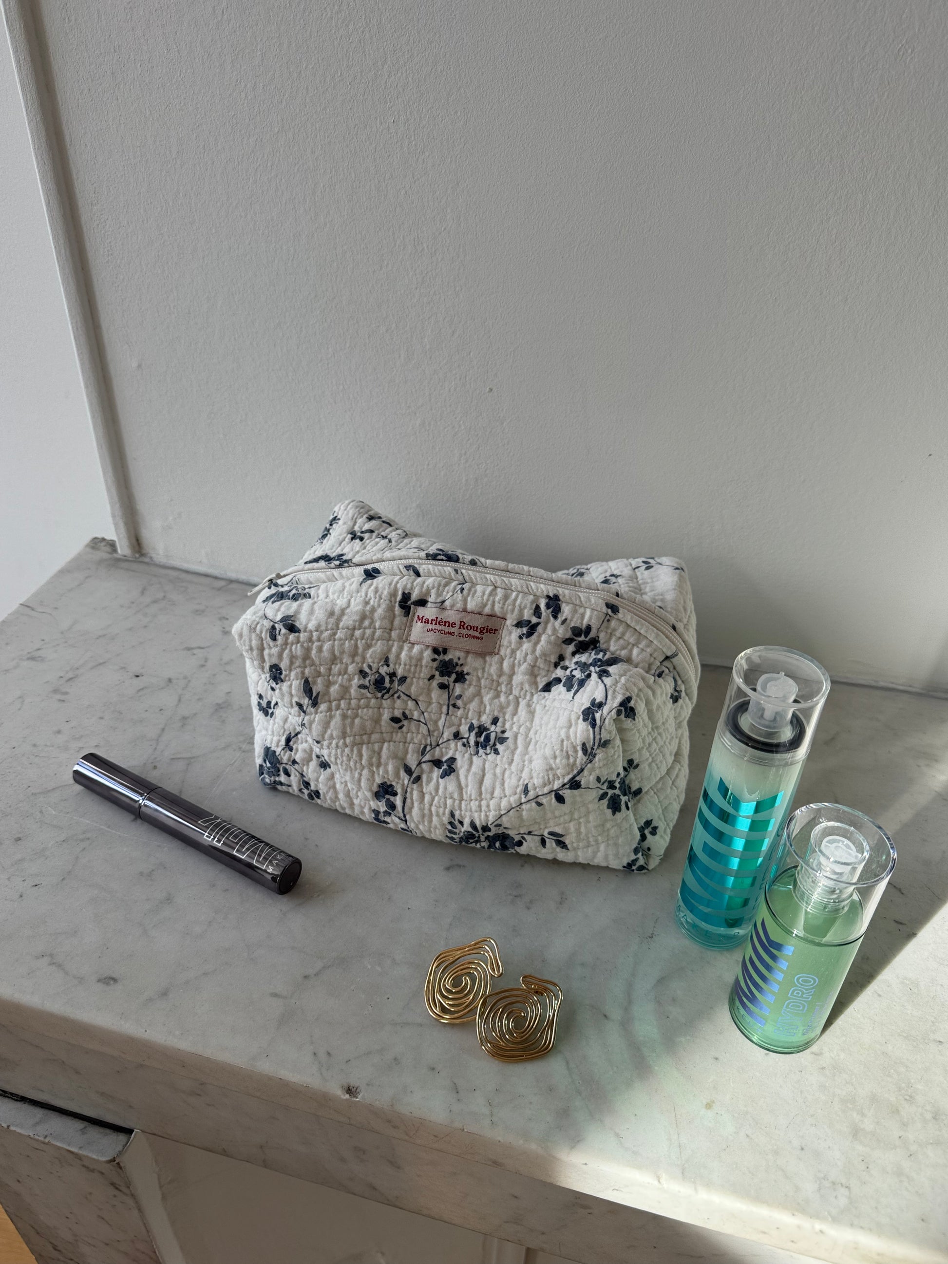 Conception : trousse upcyclée à partir d'un boutis de seconde main + doublure tissu de seconde main + fermeture éclair