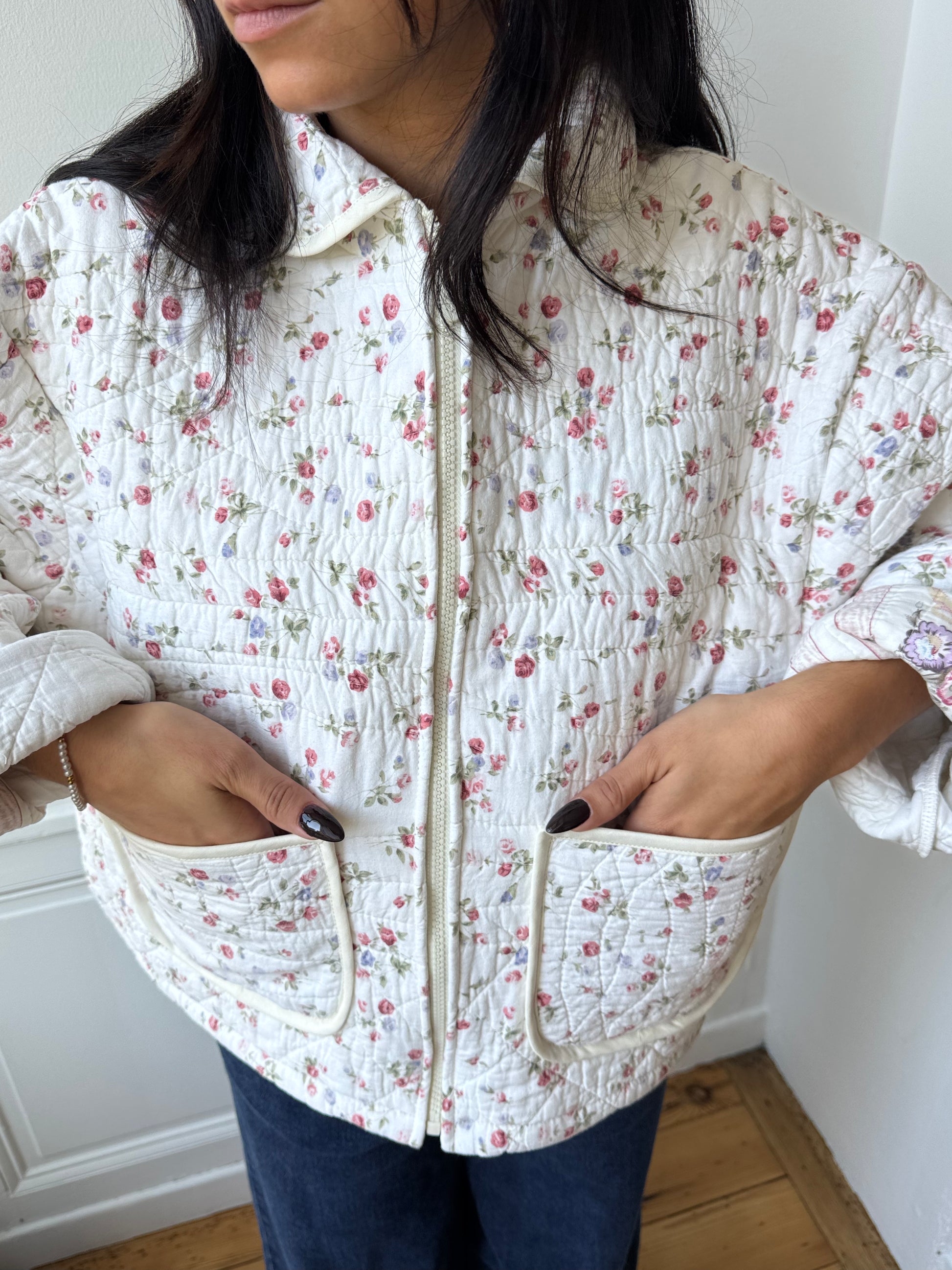 Conception : veste upcyclée à partir d'un boutis de seconde main + col et finitions biais col et poches