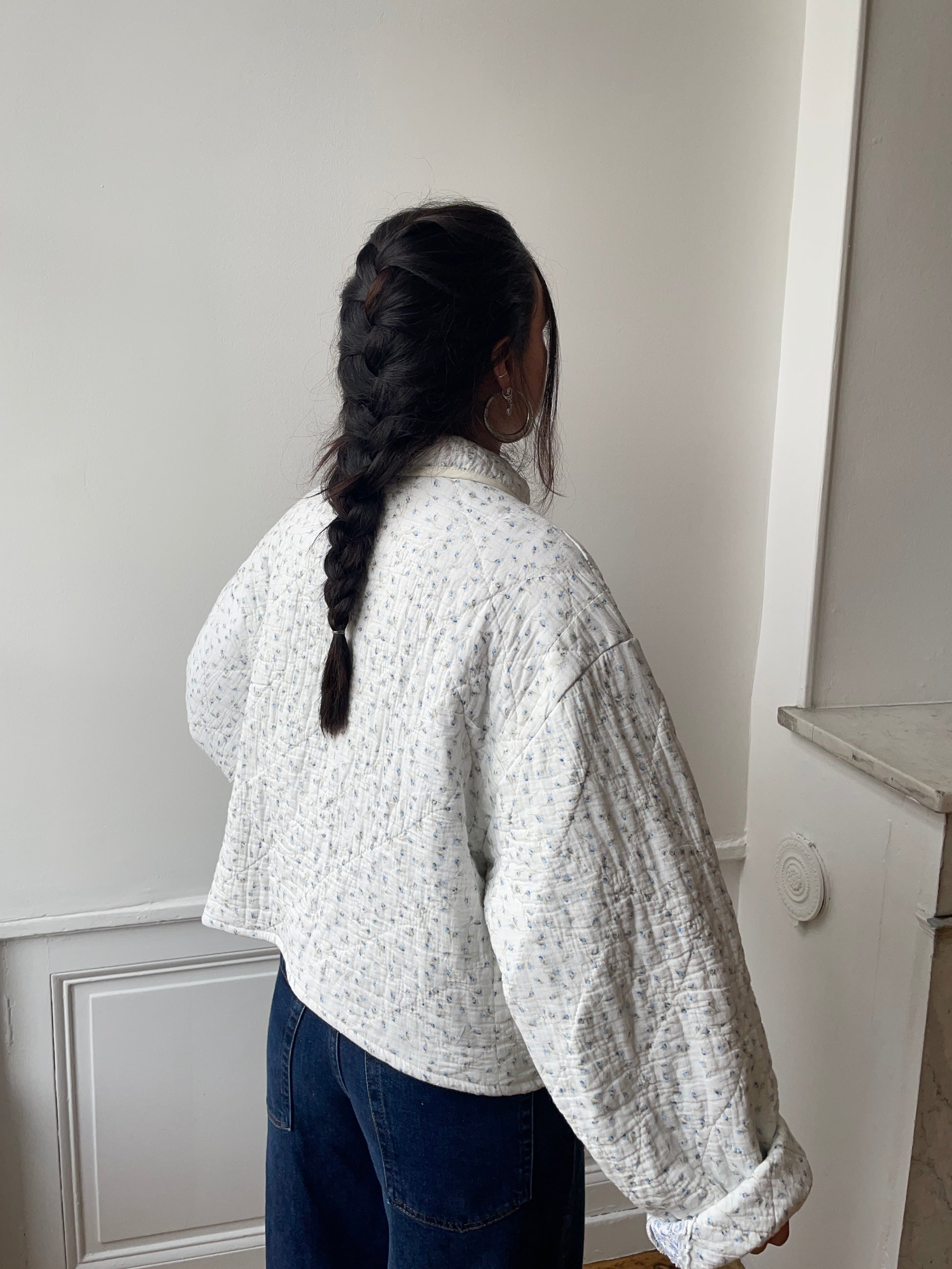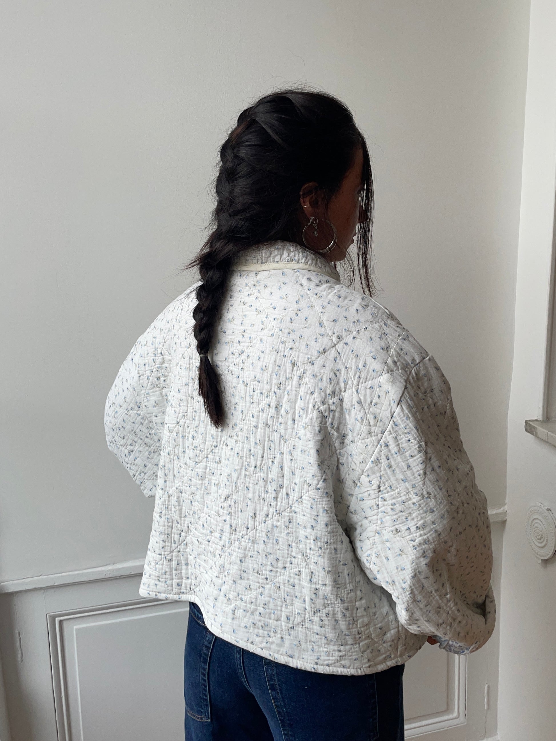 Veste upcyclée matelassée blanche à motif bleu