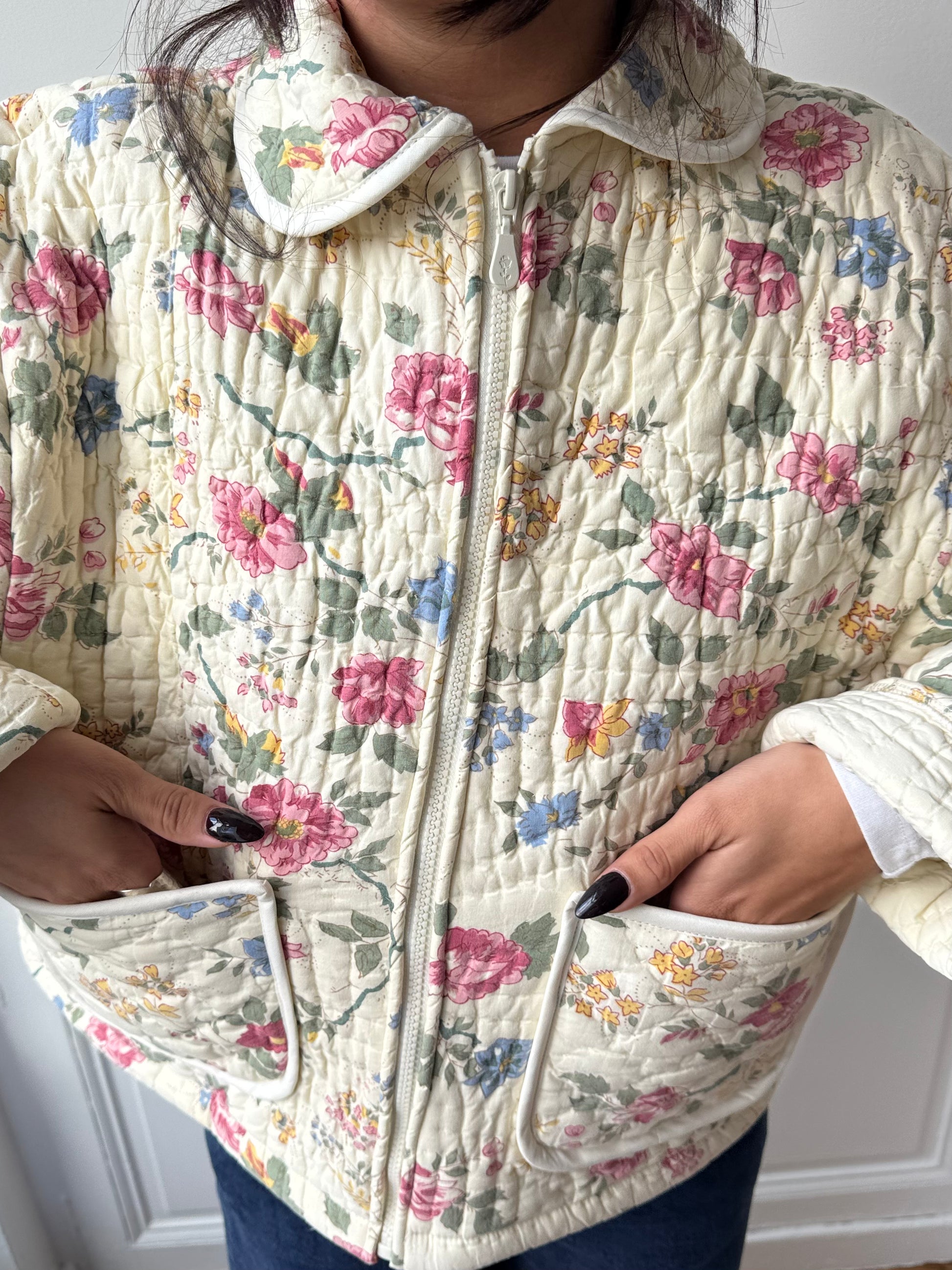 Veste upcyclée matelassée crème à fleurs