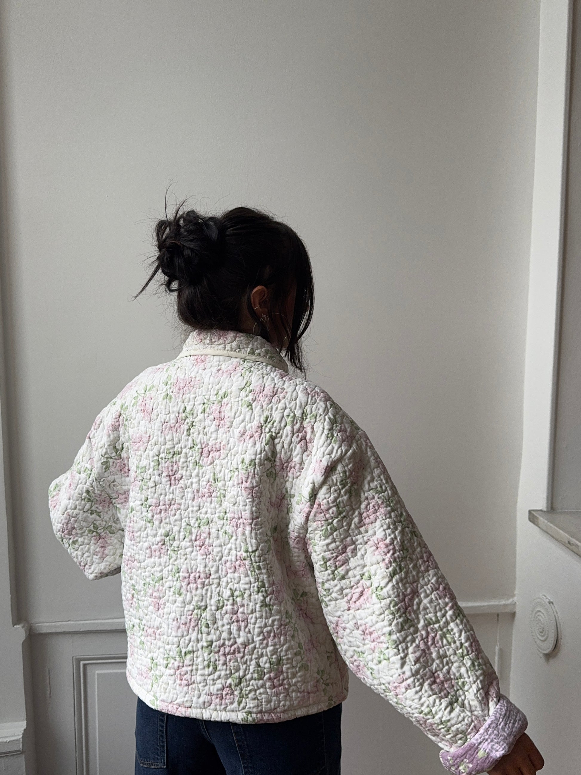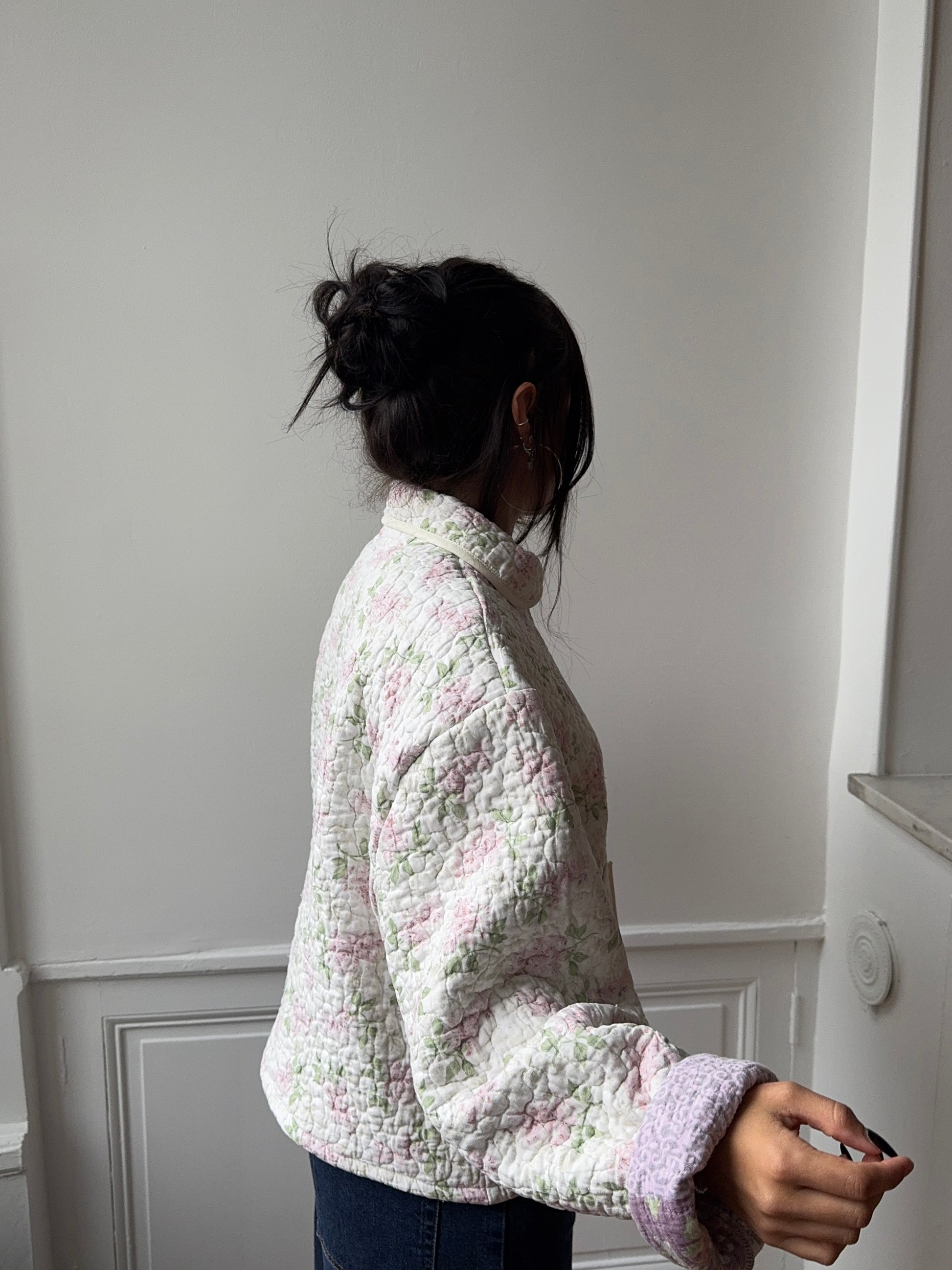 Conception : veste upcyclée à partir d'un boutis de seconde main + col et finitions biais col et poches